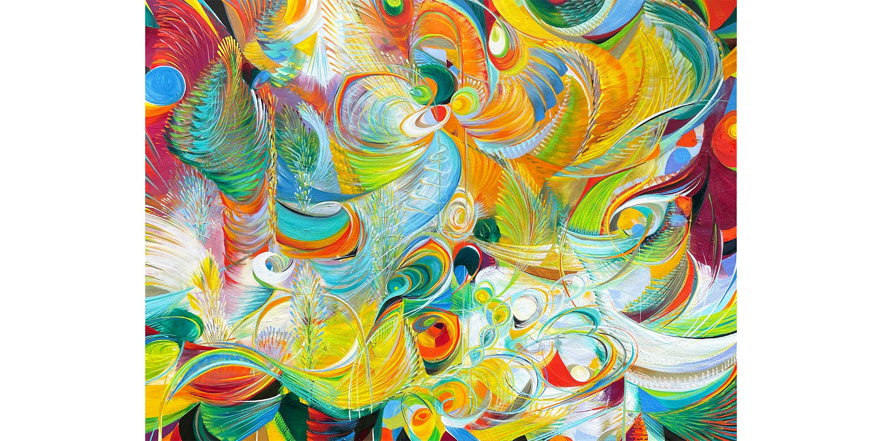 In 2020, while the world locked down for the COVID Pandemic, Wróbel prepared to welcome her first child. Now located between both California and Santa Fe, NM nearby her and her husband’s families, the paintings flowed naturally from her brush. Forms became rounder - the movement often resembling vibrations, the brushstrokes connecting from one to the next. The energy of this new person growing within brought new life and vibrance to the work. In 2021, during her first year of motherhood, the titles remind us of how life begins, such as: "In the Beginning”, ”First Breath,” “Miracle of Being." Time both stops and moves quickly with a newborn and young child, and Wróbel explored this idea in her new work.