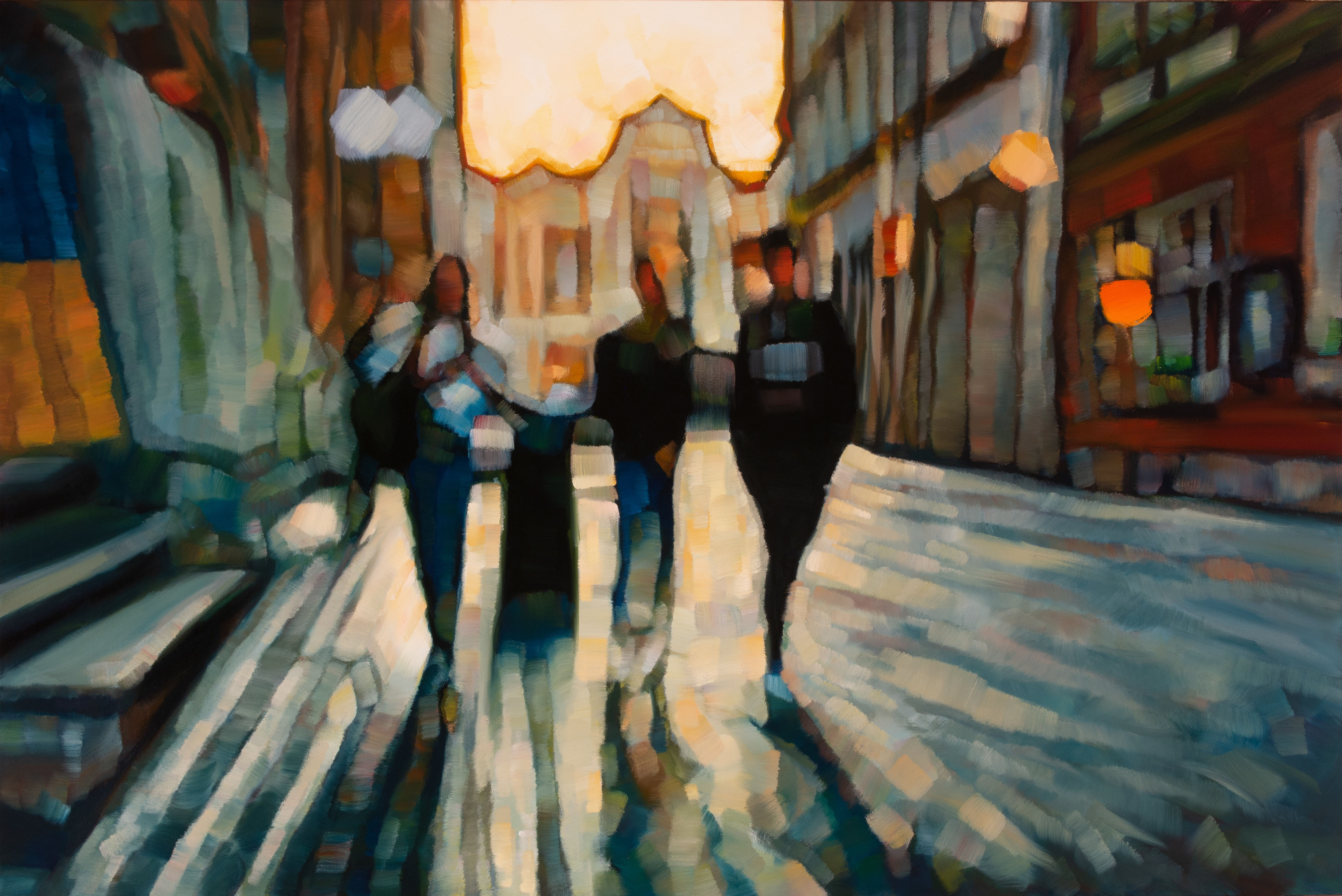 Paintings such as “Arriving” (above), which depicts displaced Ukrainians in Poland, strike notes of hope and loss. Four dark figures walk toward us, the golden sky behind them casting reflections on the street. Lights blur into glowing baubles. Everything and nothing is tangible: The narrow street, the buildings, the solid figures; they seem to be slipping by, but filled with the particular intensity of their moment.