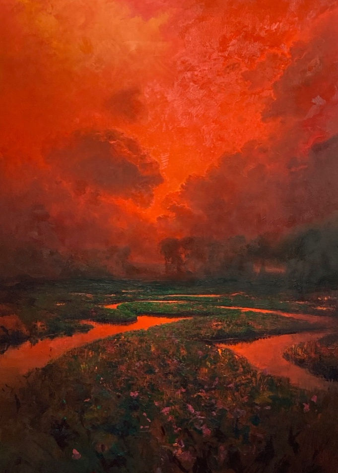 Neusser’s skies are vast and ripe with spiritual and emotional undertones, like those of J.M.W. Turner and Hudson River School painters such as Thomas Cole and Fitz Henry Lane. The cloud-clotted, fiery-orange sky in “Red Marsh (2308)” (above) looks apocalyptic, but it was inspired by Massachusetts marshland, not wildfires. The still water snaking through reedy grass mirrors the penetratingly orange sky. Get close to look at Neusser’s fleet, unpredictable brushwork in those reeds: Specks and streaks in deep green, and over that, flecks of rose resembling petals or wings. It’s busy, painterly, full of gesture – and yet it results in hyperrealism.